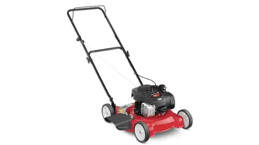 This Yard Machines 20″ push mower (made by MTD) is about as bare bones as you can get (outside of a Reel mower.) Just add the oil (included) and gas (not included) and you’re ready to go.